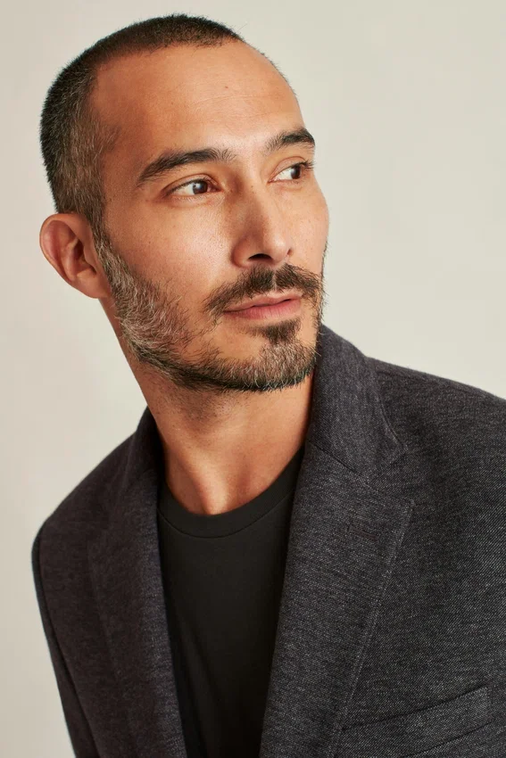 Il modello è alto 188 cm con un torace di 102 cm e indossa una 40R in Slim Fit