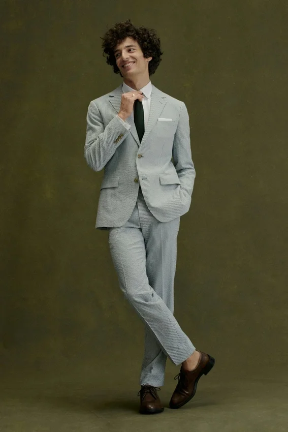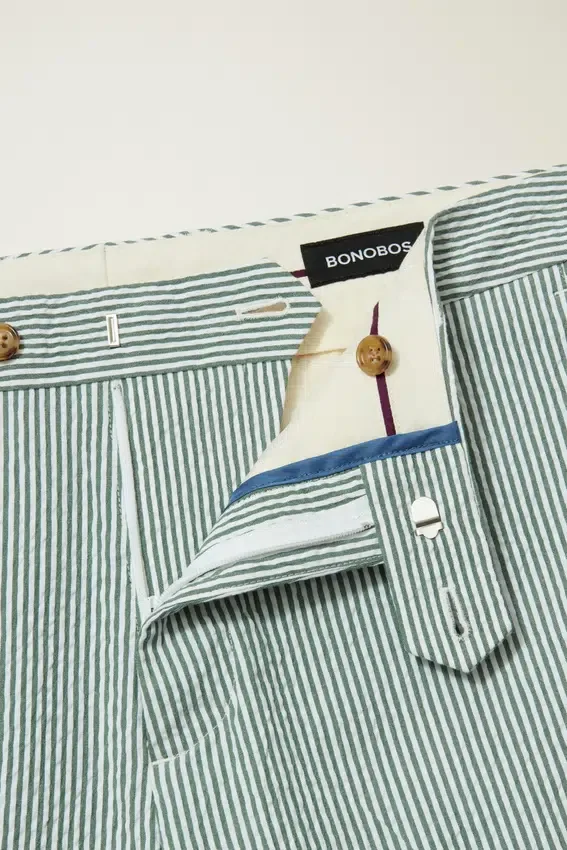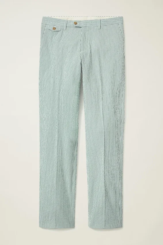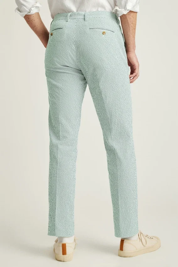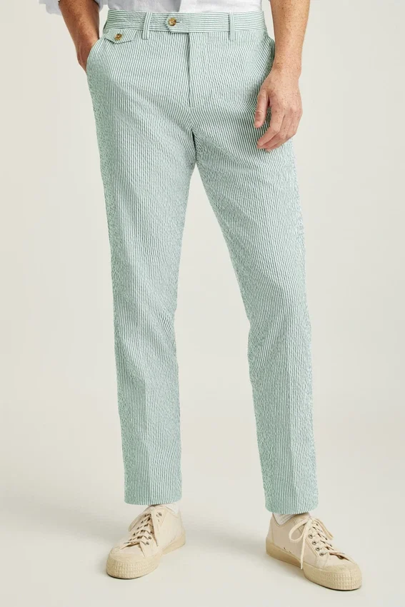 Pantaloni eleganti in cotone seersucker leggero, pronti ad aggiungere un tocco di fascino a qualsiasi occasione nella stagione calda.