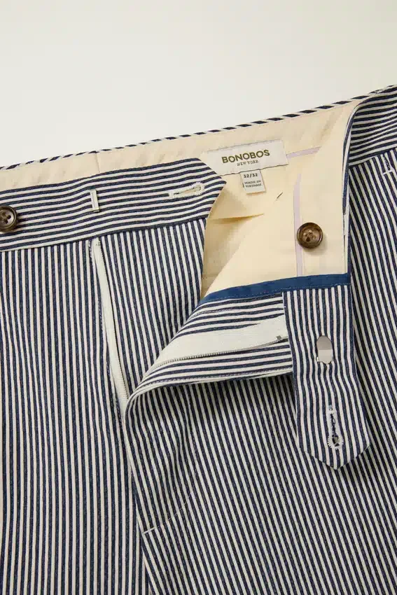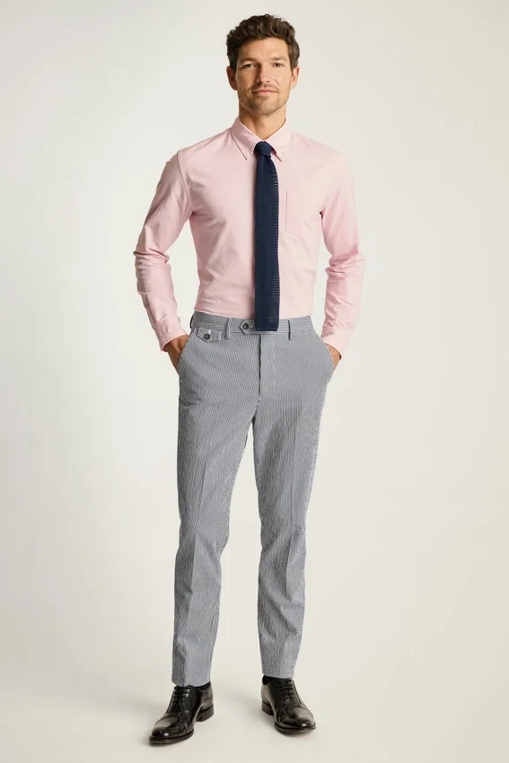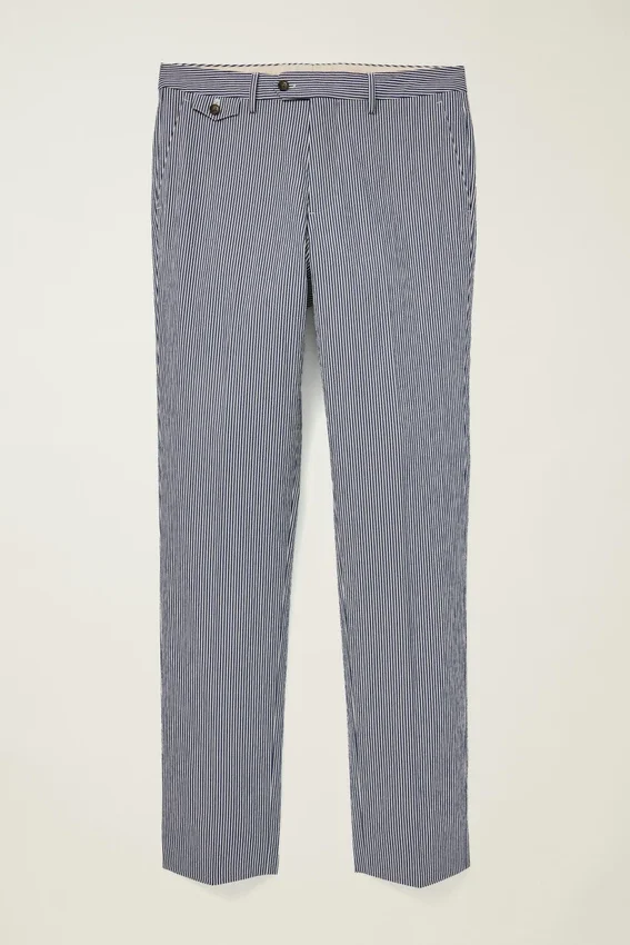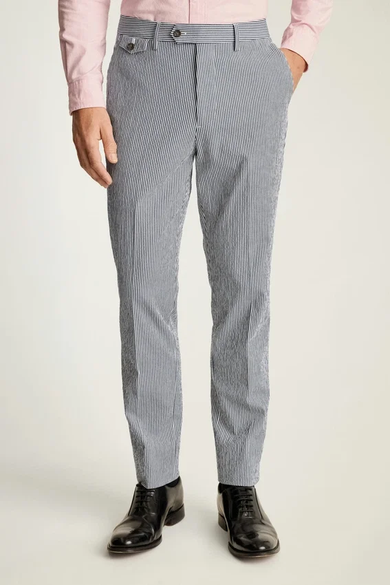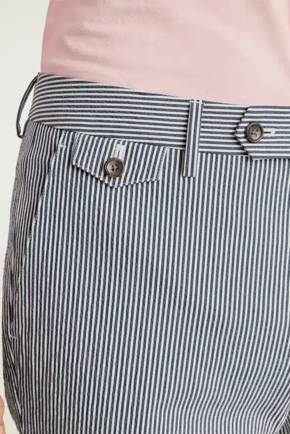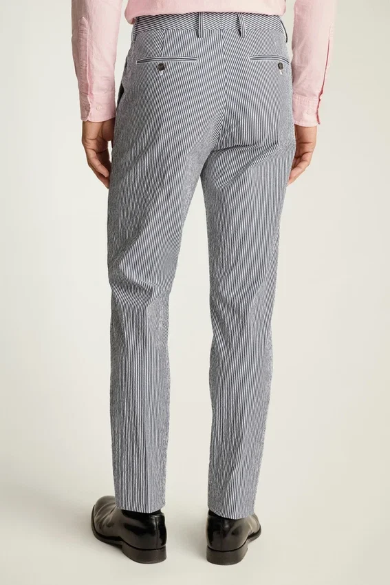 Pantaloni eleganti in cotone seersucker leggero, pronti ad aggiungere un tocco di fascino a qualsiasi occasione nella stagione calda.