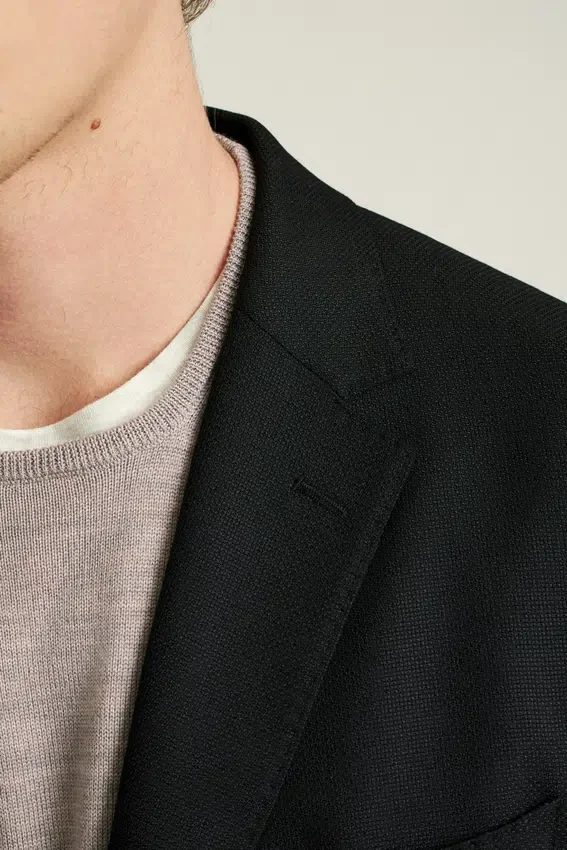 Costruzione leggera e fodera minima | Lana Hopsack traspirante proveniente dal lanificio italiano Marzotto | Revers da 8,25 cm | Tasche applicate | Monopetto a due bottoni | Interno sfoderato con rinforzo sulle spalle e bordatura sulle cuciture | Maniche foderate | Bottoni non funzionali sui polsini | Doppio spacco | Tasche interne a filetto